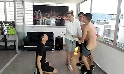 Four twinks enjoy gay group fuck-fest party